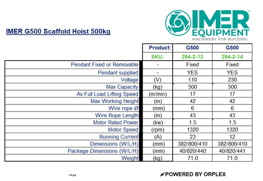 IMER G500 Complete Builders Gantry Hoist 500kg - 110v - 42m Wire Rope