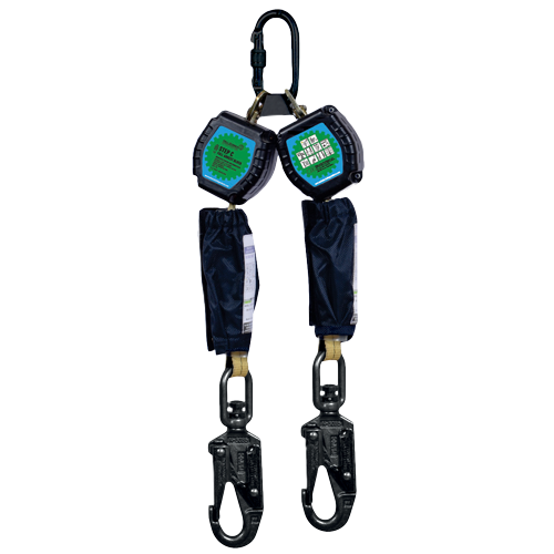 Twin lightweight, rugged, auto retracting 2m kevlar webbing blocks with shock absorbers, double action swivel snap hooks with fall indicators to EN360:2002 for vertical and horizontal use.