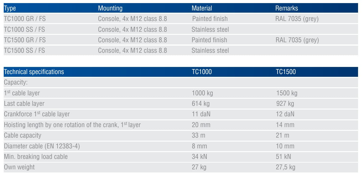The Gebuwin range of hand driven spur gear winches are known for their robust construction. The cranks can be adjusted in length and are recoil-free. All rotating parts run in maintenance free bearings. The TC1000 and TC1500 have a closed spur gear casing.