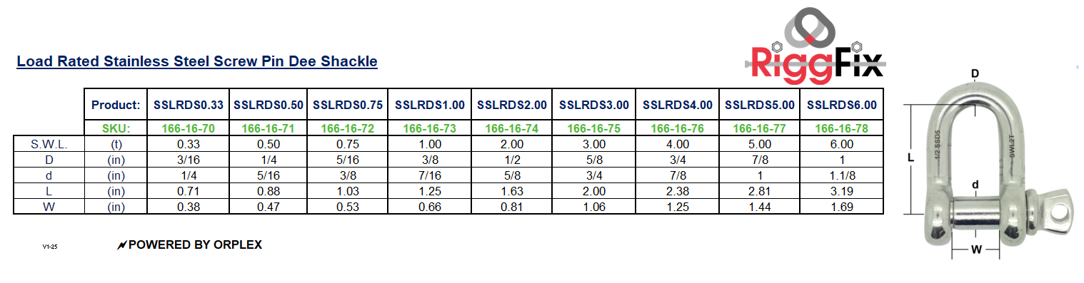 Load Rated Stainless Steel Screw Pin Dee Shackle Ref: 166-16