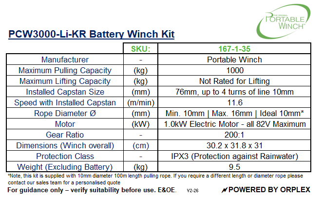PCW3000-LI-KR Battery | 1000kg Capstan Winch Kit - Inc Battery & Charger & 100m Rope
