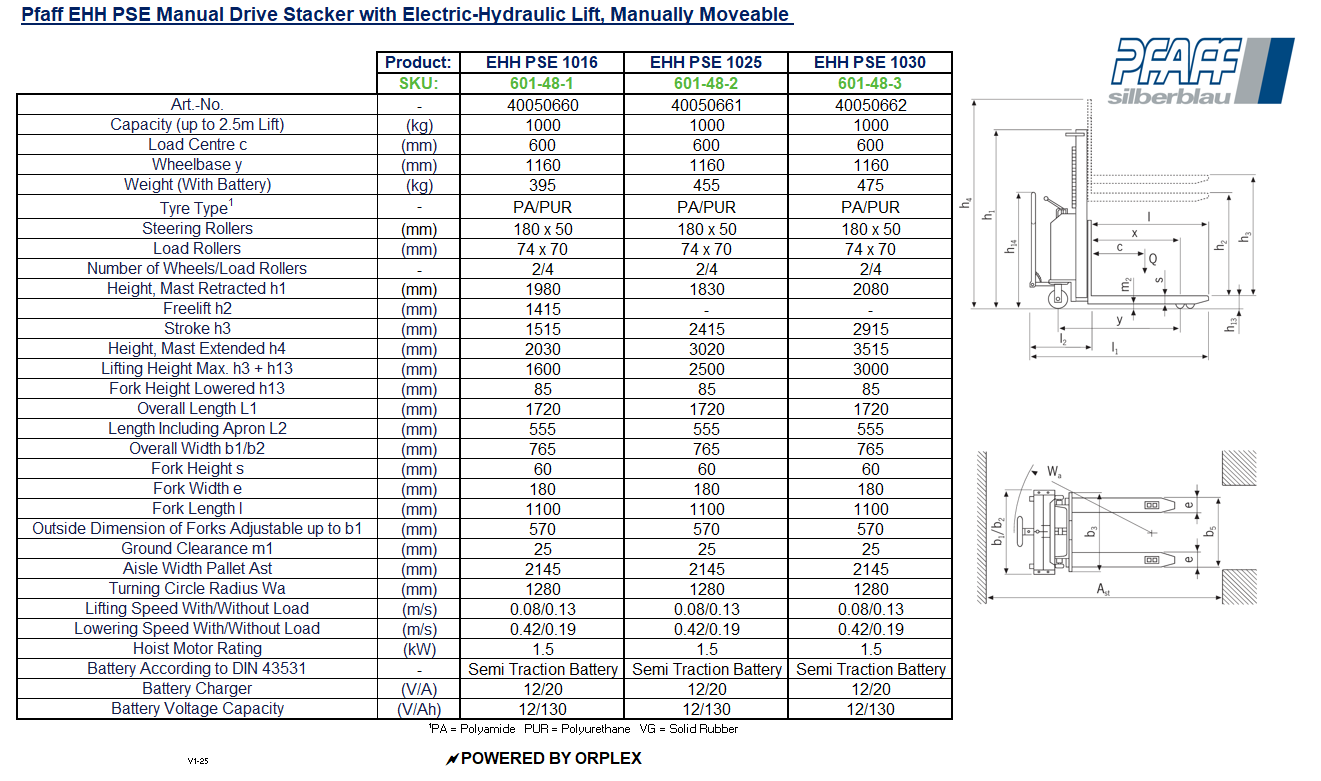 Pfaff EHH PSE Manual Stacker – 1000kg, 3000mm Electric Lift