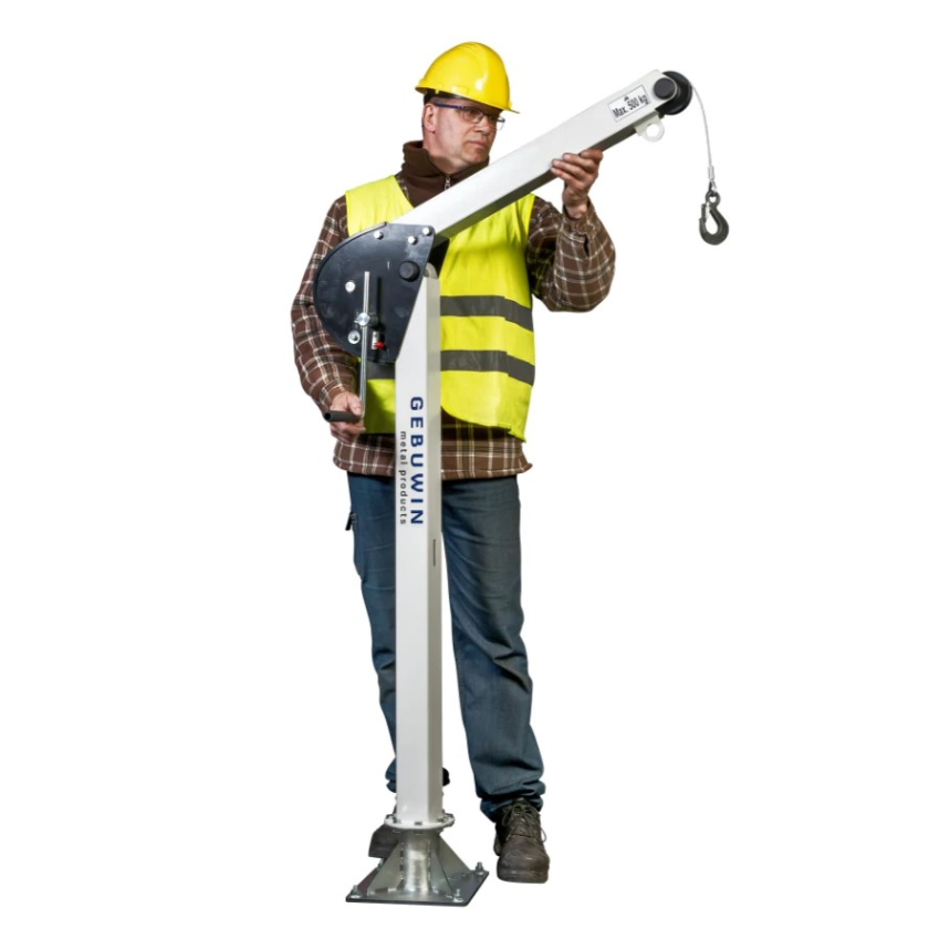 Gebuwin has developed this modern designed folding swivel davit crane especially for lifting goods on location. This davit crane helps you carry out your work efficiently without the risk of physical strain. Gebuwin produces three types of lifting davits, which vary in lifting capacity and length of the boom. Because of the integrated winch and cable, the davit crane is not only compact but also low-maintenance. The crank is also adjustable in length, so that the lifting speed can be adjusted. It is a very good solution to lift or lower a load in a very user-friendly way