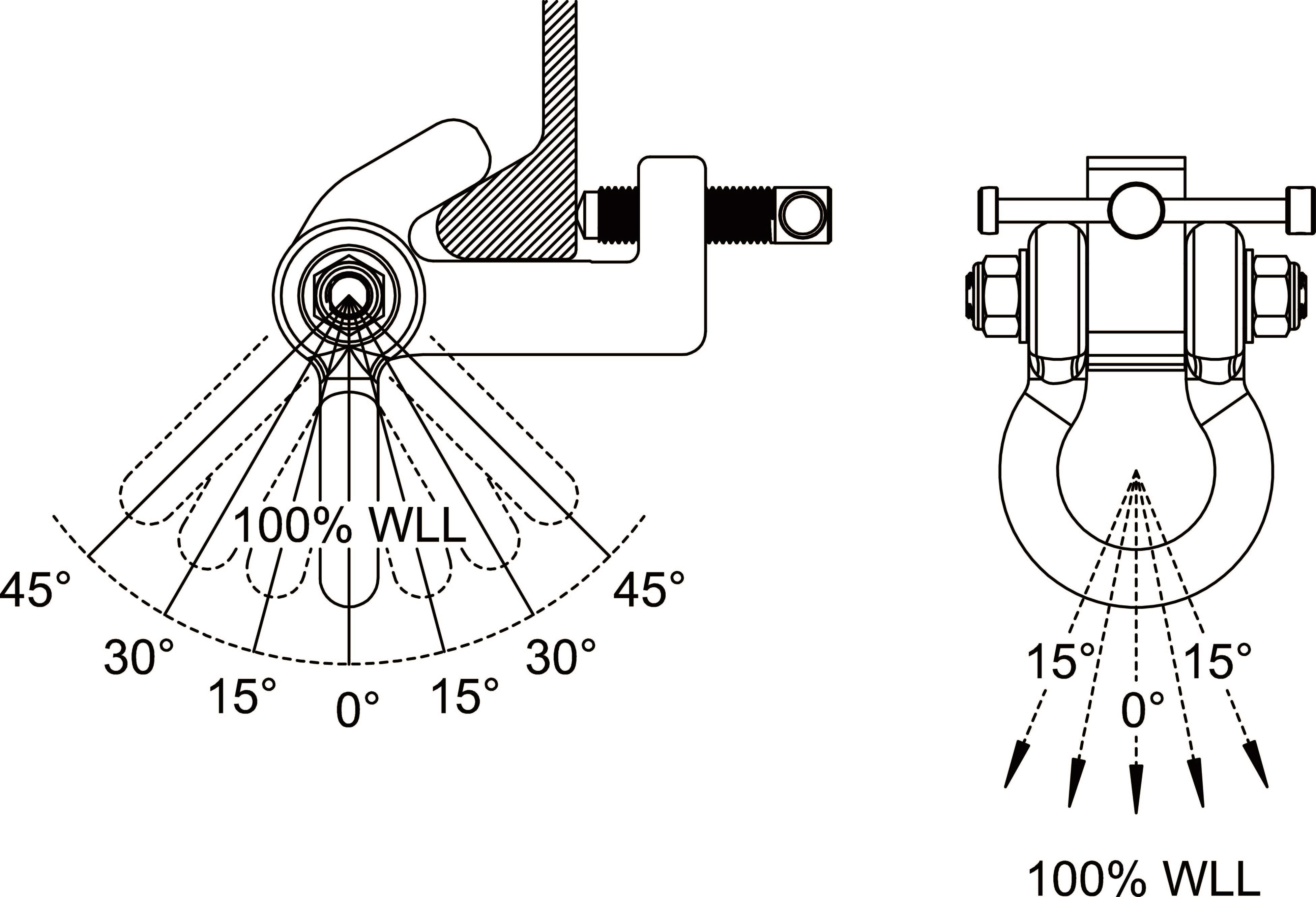 - Factor of safety: 5:1 for straight pulling and lifting, 4:1 at other angles stated above