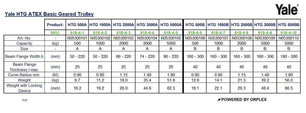 Yale HTG ATEX Basic Geared Trolley 1000kg – Beam Width 160-300mm